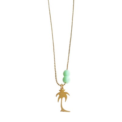 For the “Palm Tree Island” necklace, I used a gold-plated palm tree, gilded 1mm ball chain, a clasp and turquoise glass beads.